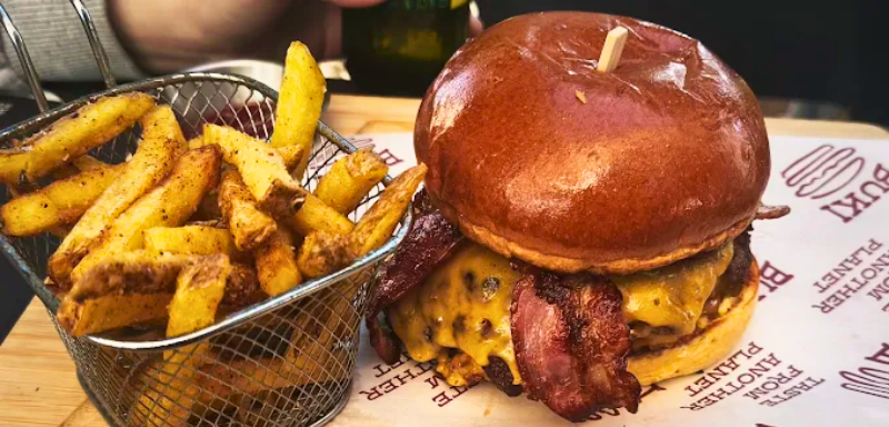 En Buki Burgers, hamburguesería en Córdoba hacemos hamburguesas de otro planeta: pan tierno, carne jugosa al punto y queso derritiéndose en combinaciones que cambian el juego. Súmale nuestras loaded fries (patatas con queso y bacon bien cargadas), alitas crujientes y salsas propias para un bocado de 10.